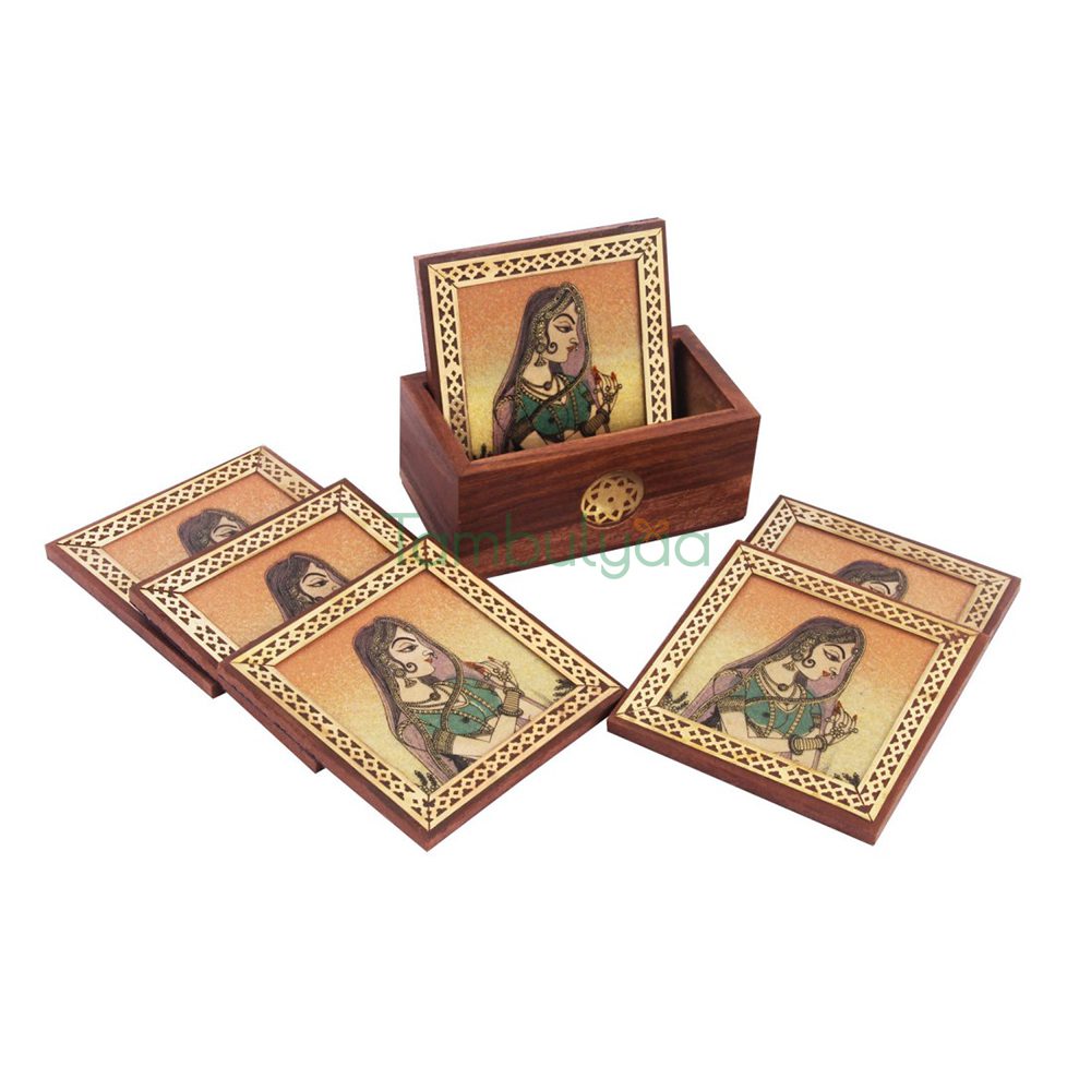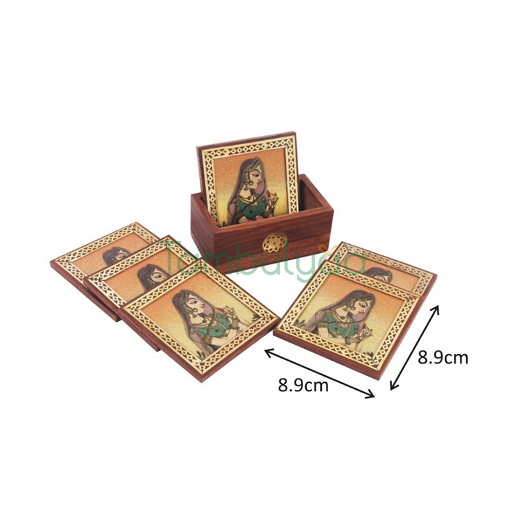 This artistic Shisham wood Coaster made by Natural Stones of different colors by Handicrafts Paradise is an amazing piece of Art.The real gemstone work with different stones of different colors and designs on glass makes it very appealing to the eyes.Traditional Rajathani Painting have been Created with Natural gemstones and Coaster have been made out of them.Coasters protect the Hardwood surfaces from dripping glasses and hot mugs. They can be used as coasters as well as decorative piece of art to enhance your interiors.There is six coaster in it. They came in a wooden case to store them Beautifully. It is a rare piece for personal use and a gift for near and dear ones. It can be a good house warming gift,return gift, Anniversary gift,pooja gift.