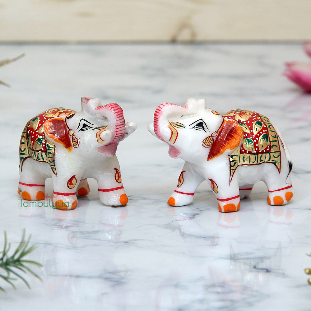 Made in makrana marble, these elephants give a feel of welcoming prosperity as they are associated with lord ganesha in indian mythology. Traditional colors, gold painting and kundans further embellish it.other than personal utility, it can be used for gifting too. Being handcrafted, it may have mild variations in the design and colour. It can be a good Gift for wedding and Anniversary..