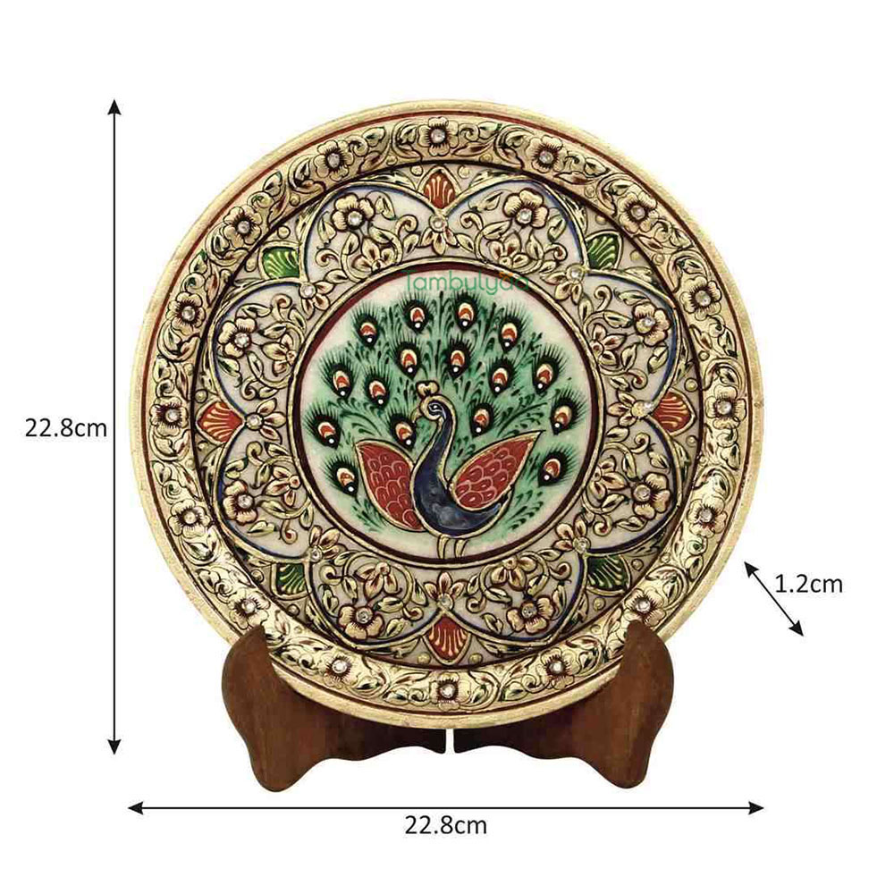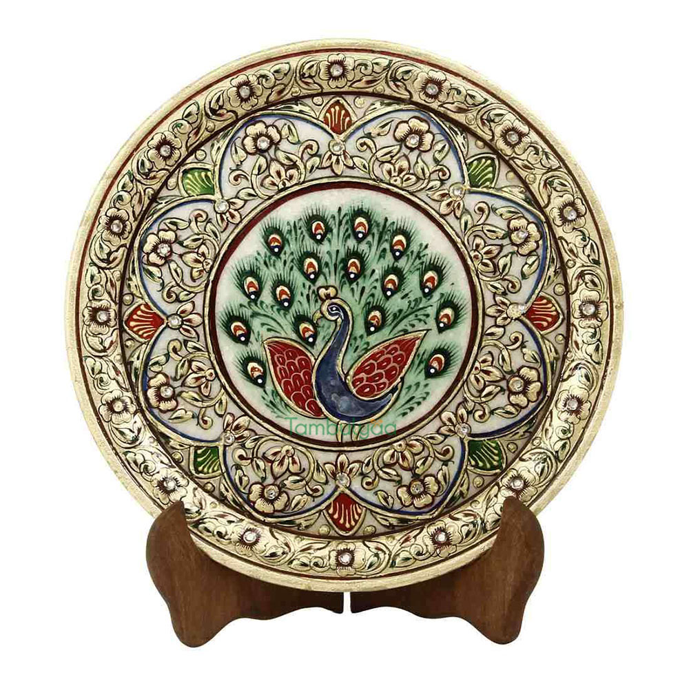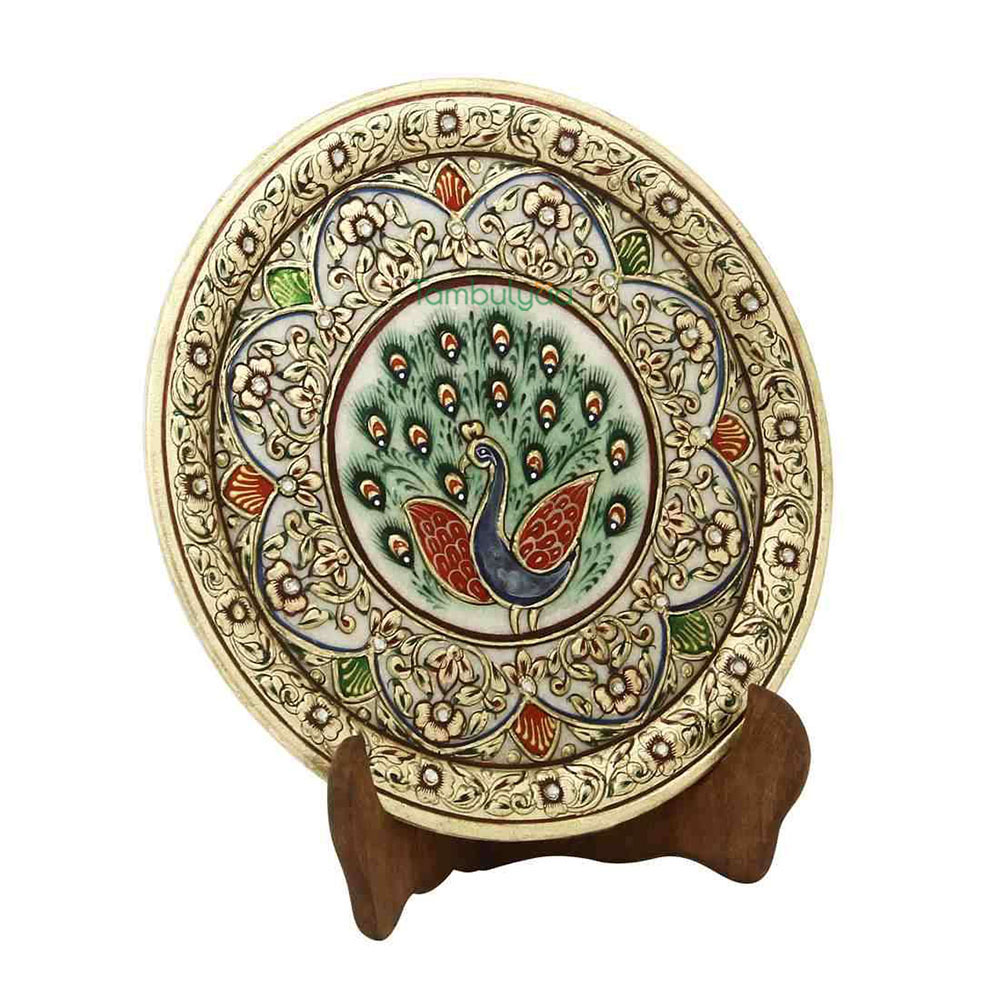 Made in makrana marble, the decorative plate has an interesting feel as it will make any corner glow. Resting on a wooden stand, the beautiful painting and theme can be seen in Mughal era work. This style of painting is done in all royal palaces of Rajasthan.Traditional colors, gold painting and kundans further embellish it. Other than personal utility, it can be used for gifting too. Being handcrafted, it may have mild variations in the design and colour. It can be a good Gift for weddings, Anniversaries and house warmings.