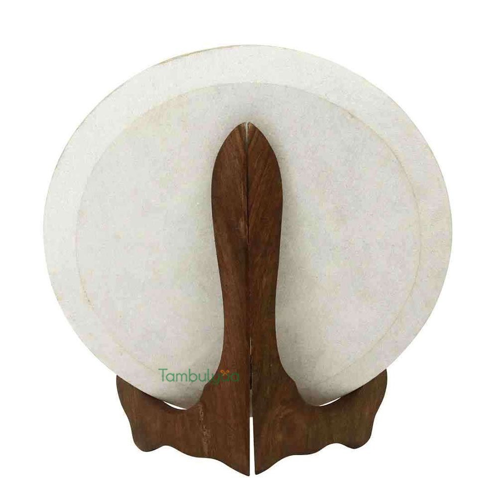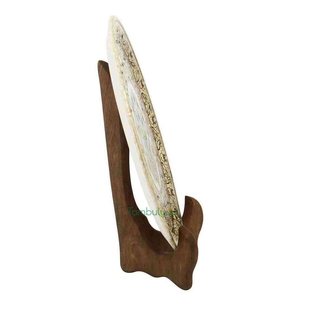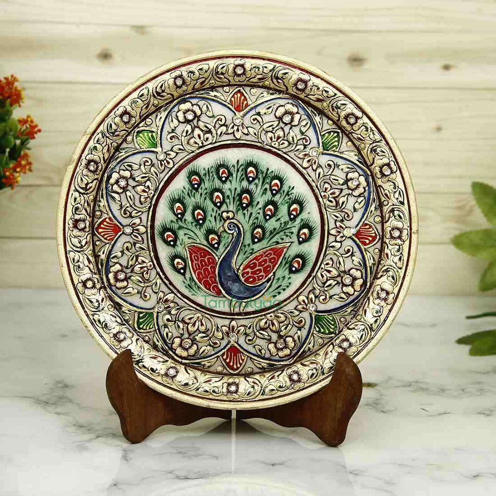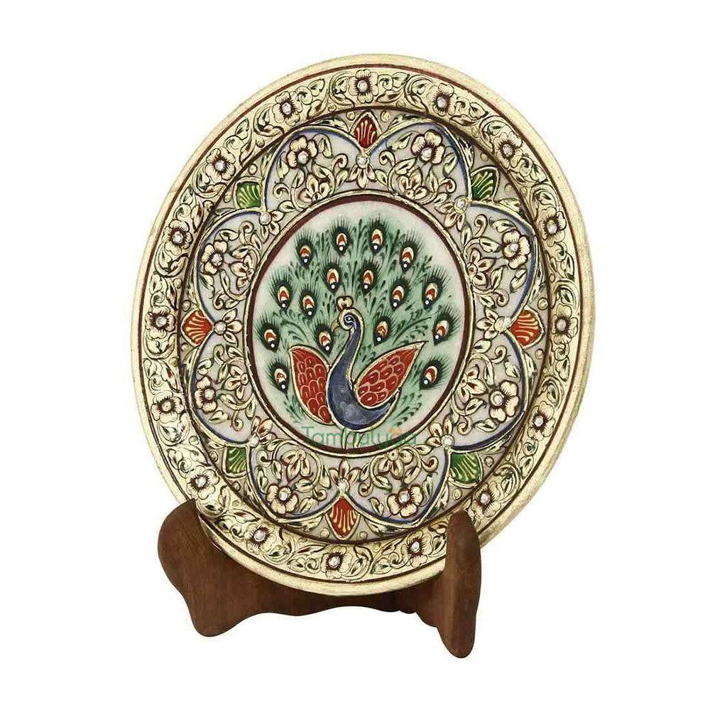 Made in makrana marble, the decorative plate has an interesting feel as it will make any corner glow. Resting on a wooden stand, the beautiful painting and theme can be seen in Mughal era work. This style of painting is done in all royal palaces of Rajasthan.Traditional colors, gold painting and kundans further embellish it. Other than personal utility, it can be used for gifting too. Being handcrafted, it may have mild variations in the design and colour. It can be a good Gift for weddings, Anniversaries and house warmings.