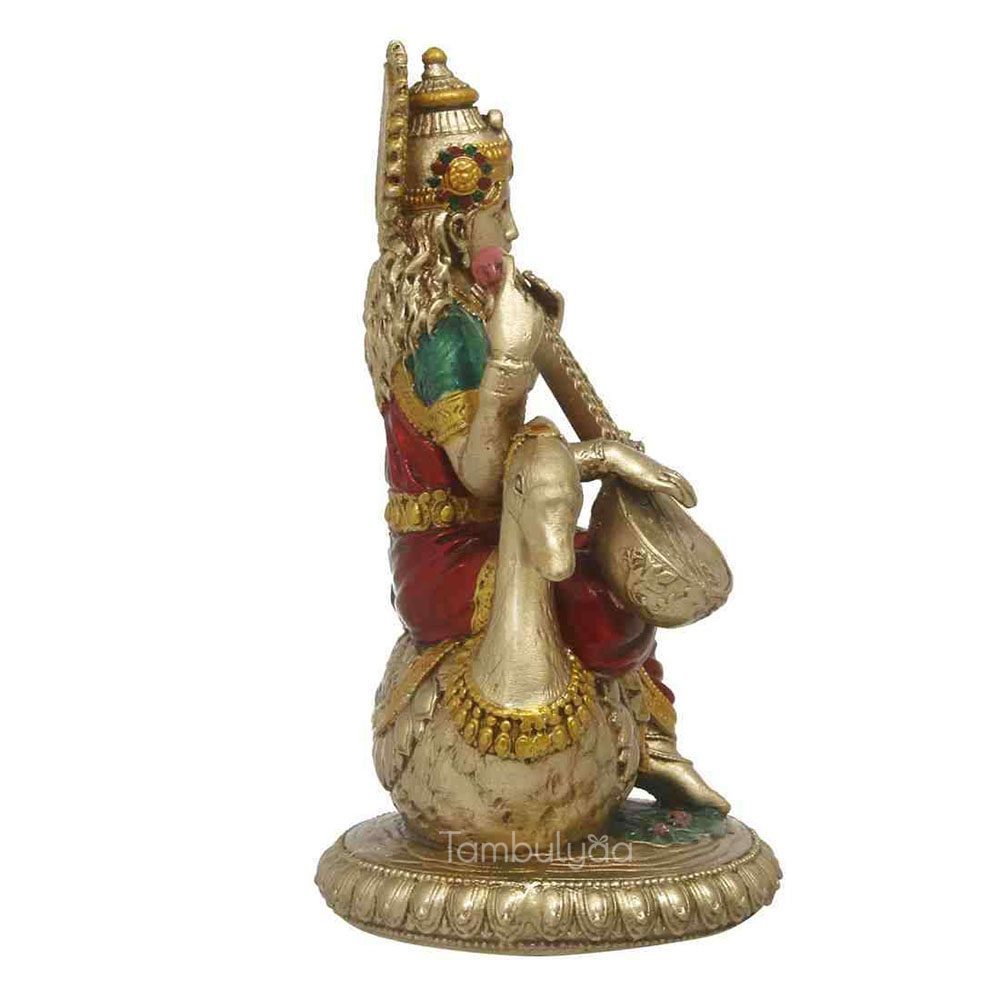 Saraswati is the Hindu goddess of knowledge, music, flowing water, abundance and wealth, art, speech, wisdom, and learning.The earliest known mention of Saraswati as a goddess is in the Rigveda. She has remained significant as a goddess from the Vedic period through the modern period. She is generally depicted with four arms (which hold four symbols: a book, a rosary, a water pot, and a musical instrument called the veena). The festival of Vasant Panchami (the fifth day of spring, and also known as Saraswati Puja and Saraswati Jayanti in many regions of India) is celebrated in her honour. Goddess Saraswati is worshipped in schools, colleges, educational institutes as well as in institutes associated with music and dance. Cultural programmes are also organised in schools and institutes on this day. This statue is made of cold cast resin and it is handmade and hand designed by the expertisans of Rajasthan.