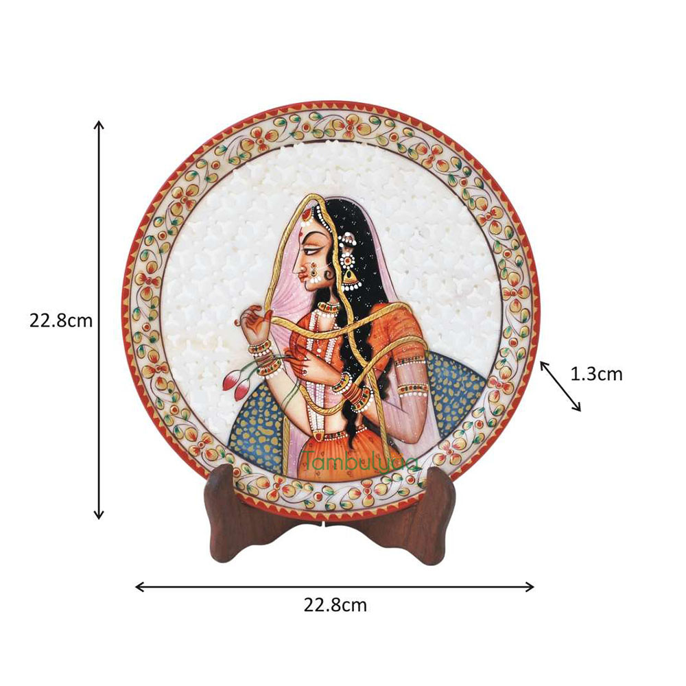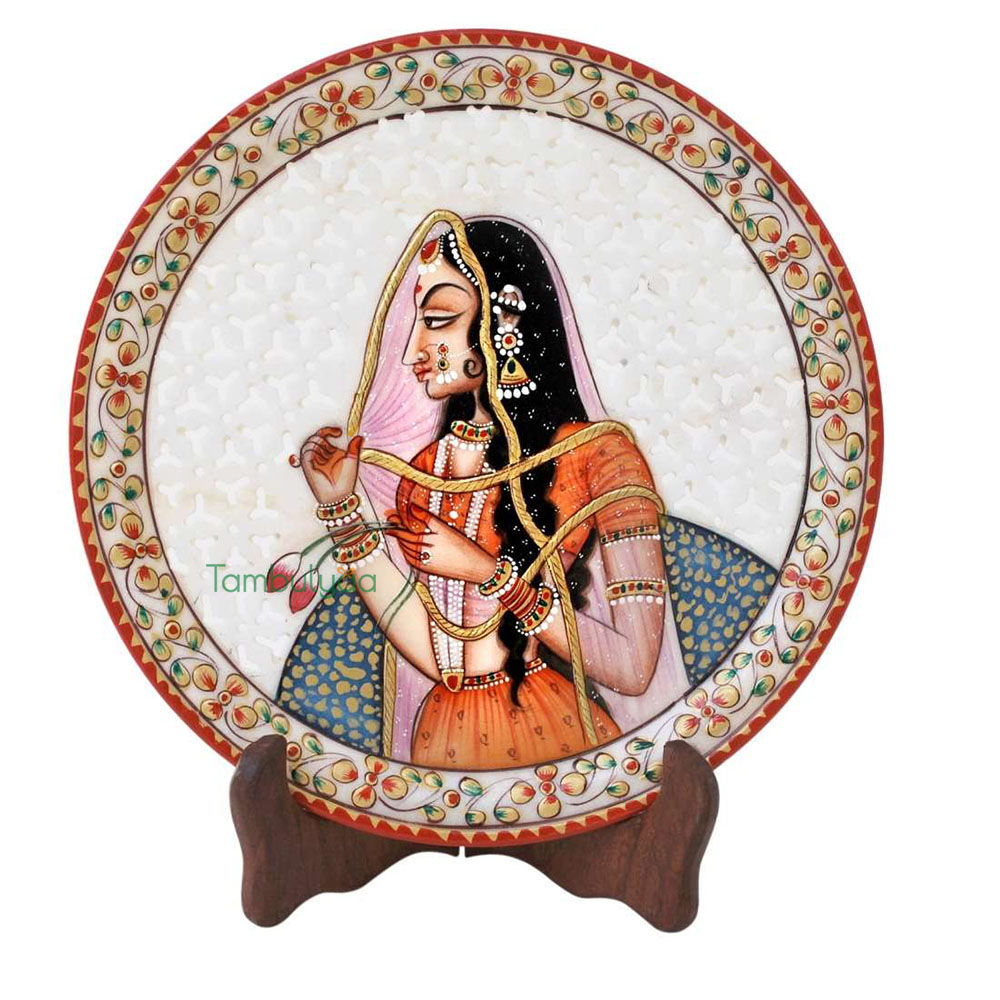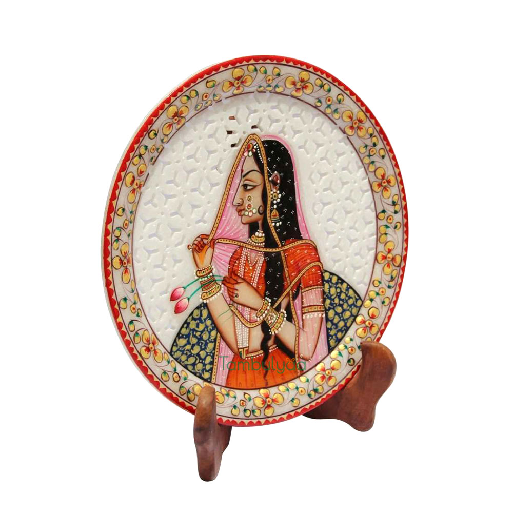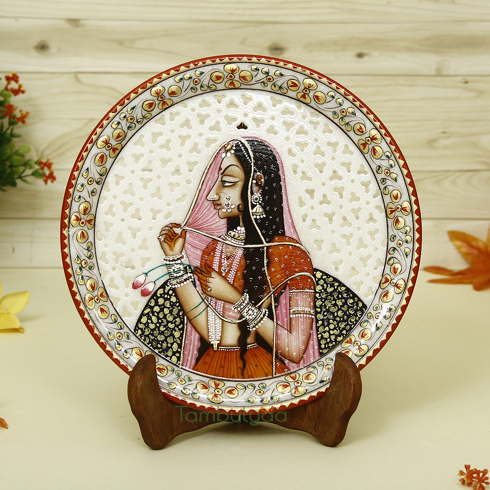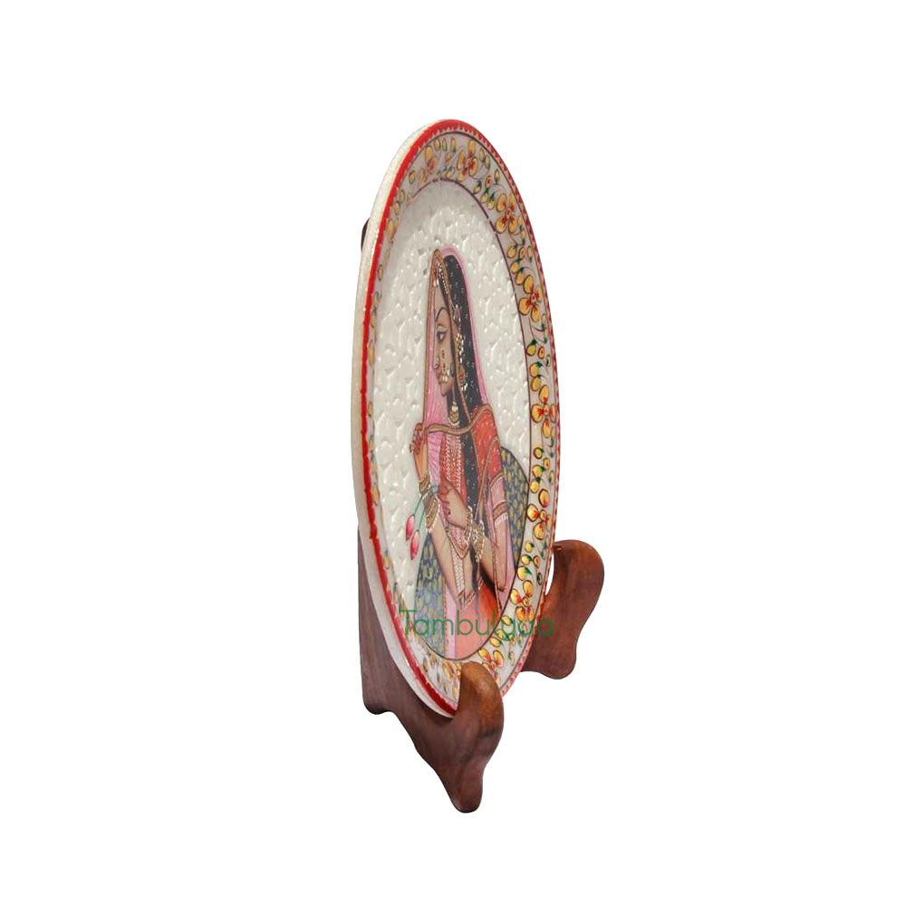 made in makrana marble, the decorative plate has an interesting feel as it will make any corner glow. Resting on a wooden stand, the product has a mughal theme with beautiful painting done on it.the cut work in the marble makes it very special . Traditional colors, gold painting and kundans further embellish it.other than personal utility, it can be used for gifting too. Being handcrafted, it may have mild variations in the design and colour. It can be a good Gift fir wedding and Anniversary..