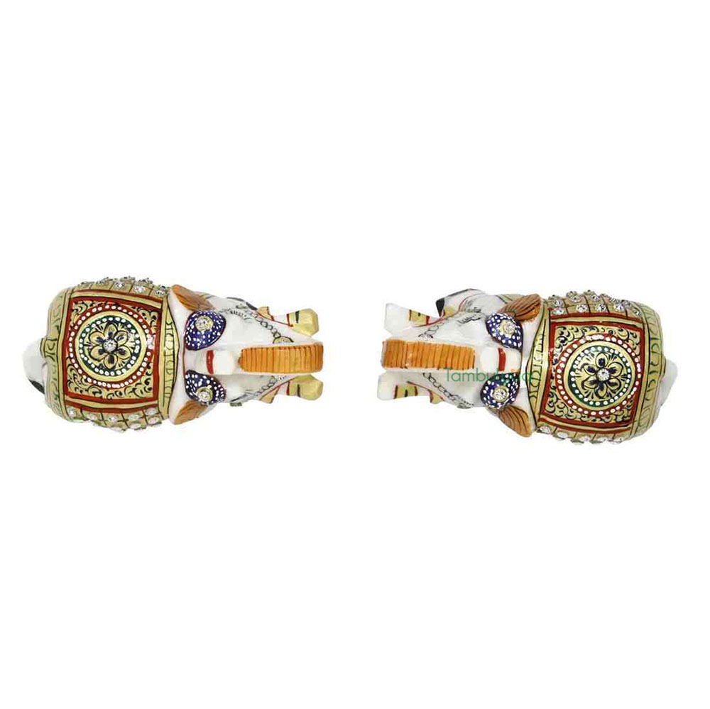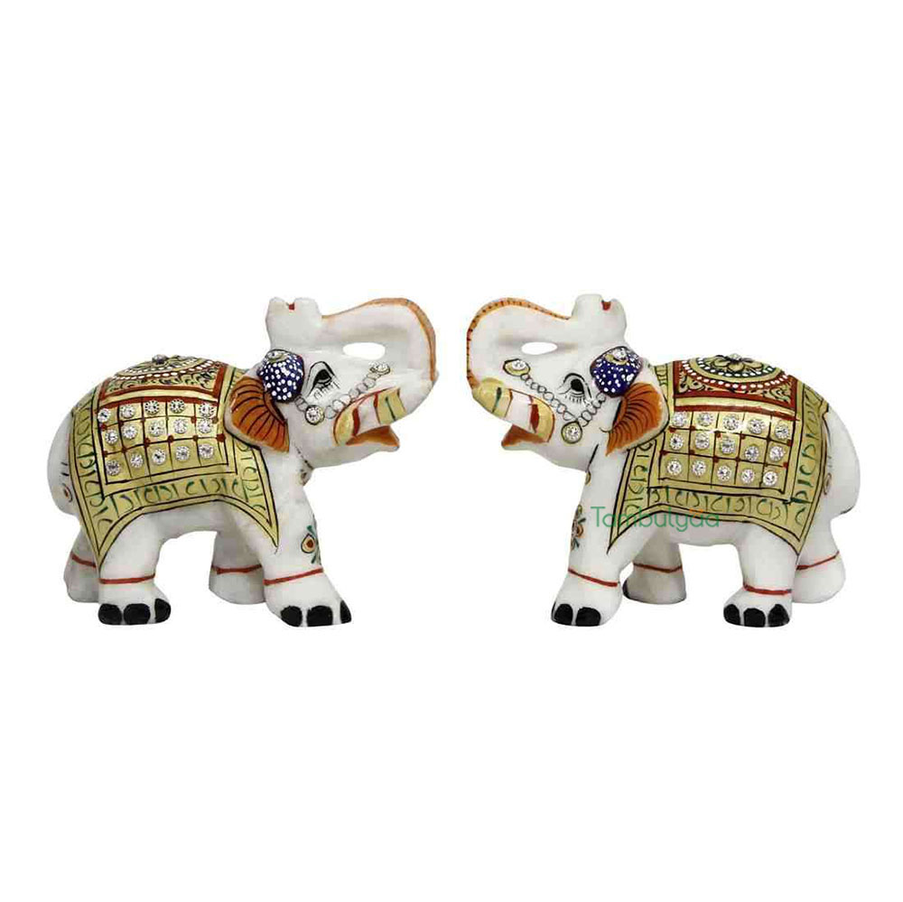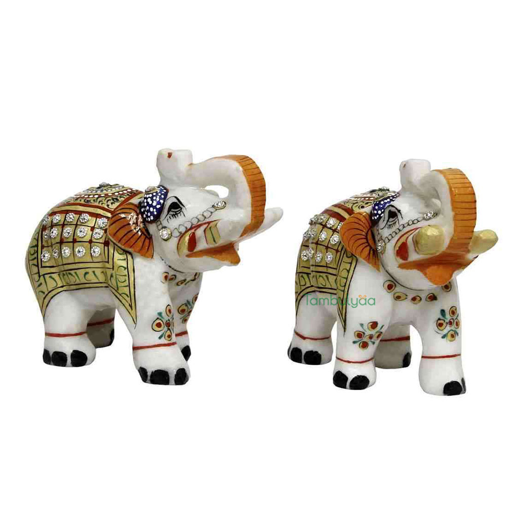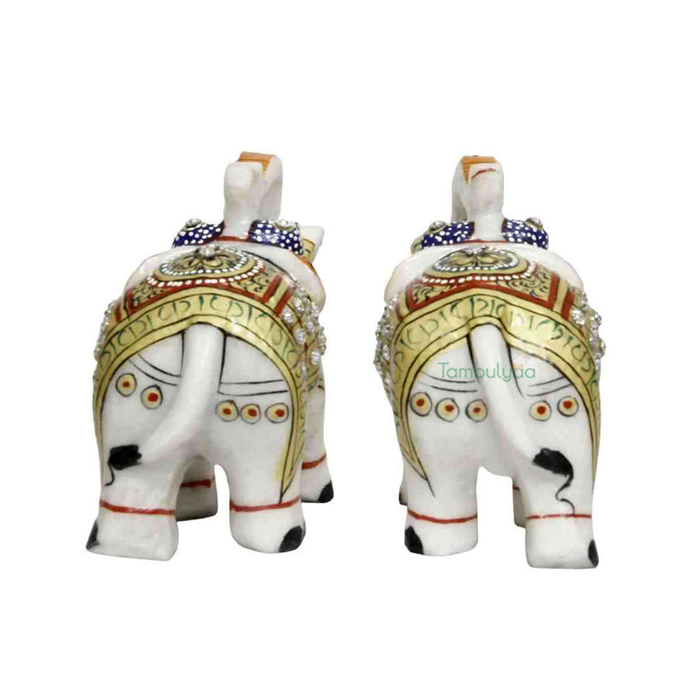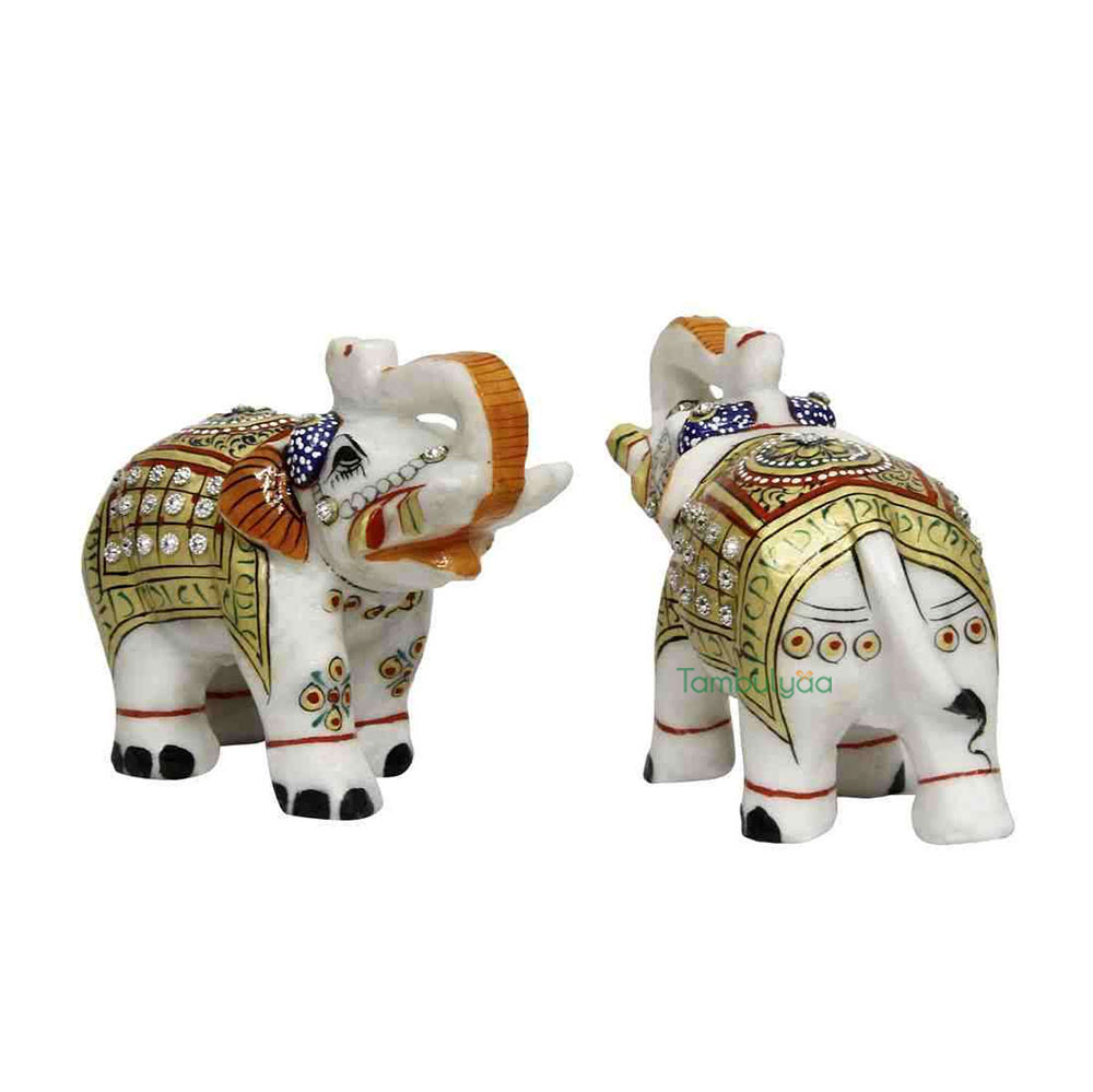 This pair of marble elephant by Tambulyaa is master Craftsmanship With Fine And Beautiful Work, This Pure White Rajasthani Marble Royal Elephant pair With Beautiful Hand Painting On their Back and Trunk Is An Epitome Of Skilful Craftsmenship. The Sculpture Features The Royal Elephants In All their Glory And Greatness. The Sculptures will make a beautiful addition To Your Home Decor.