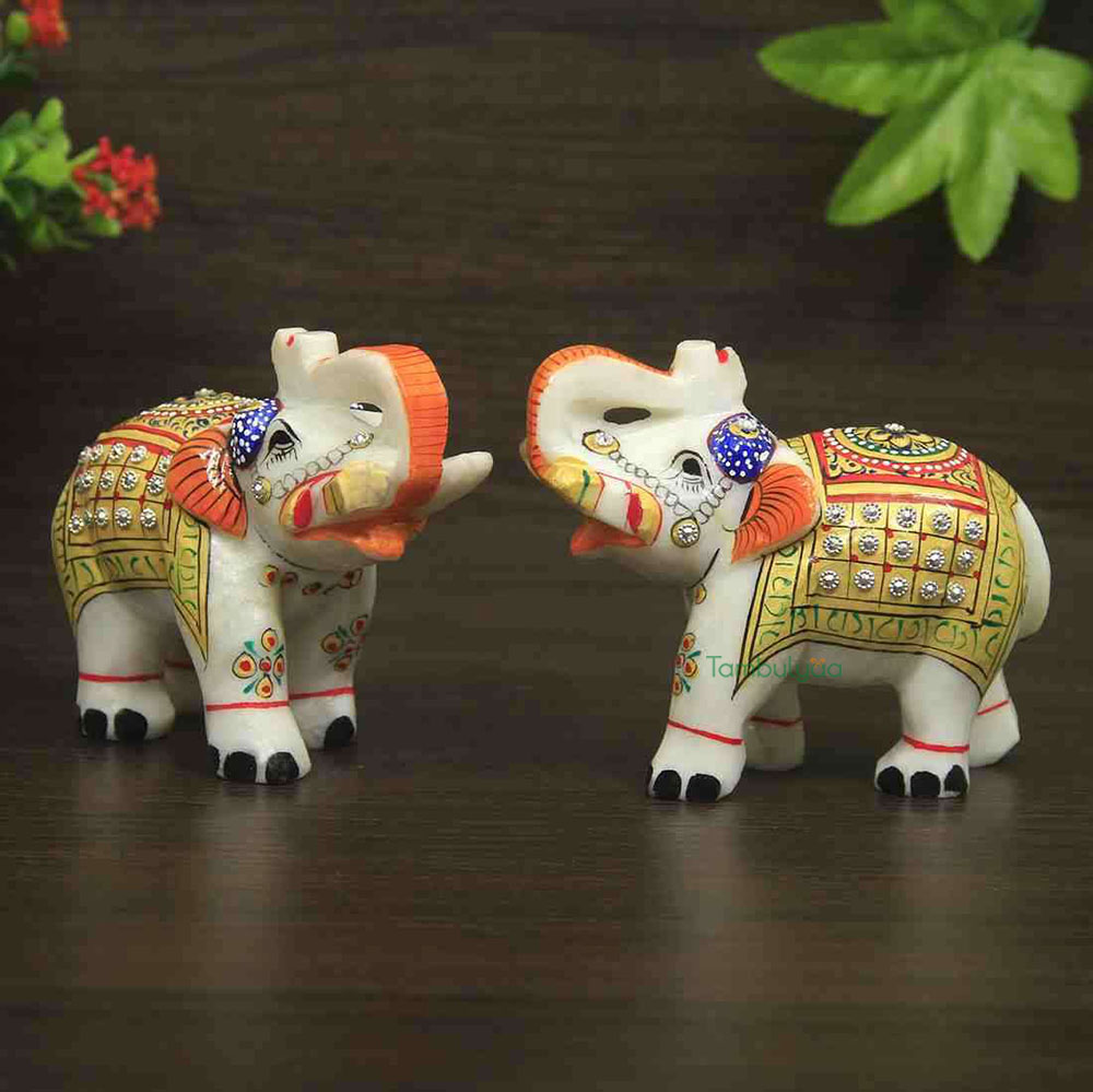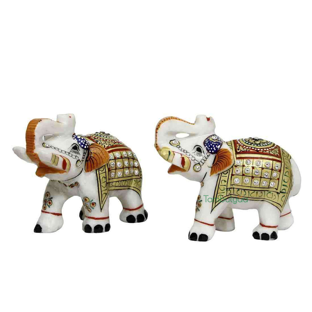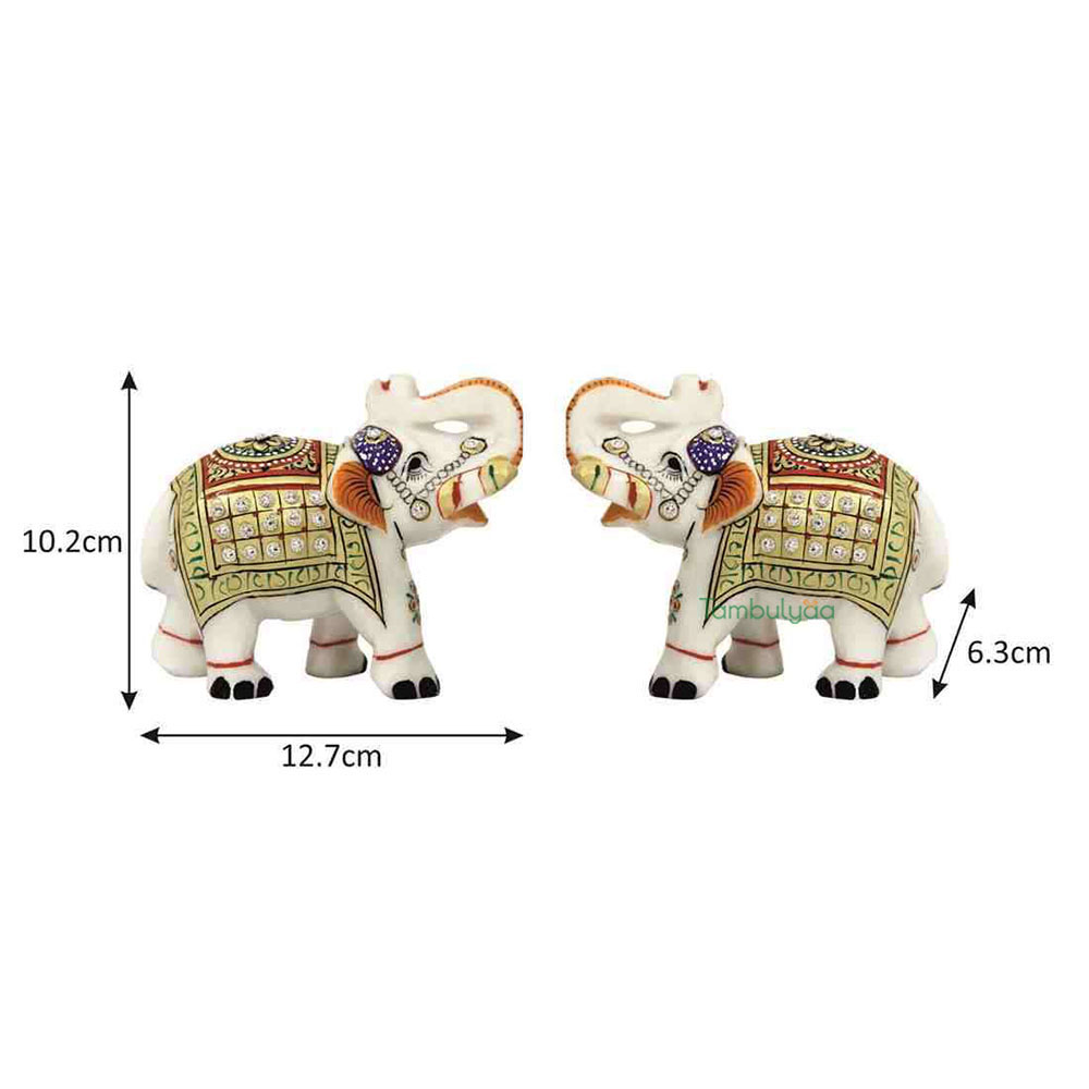Tambulyaa Marble Elephant Pair Embellished and Hand Painted Showpiece for Home Decor – 4 inches