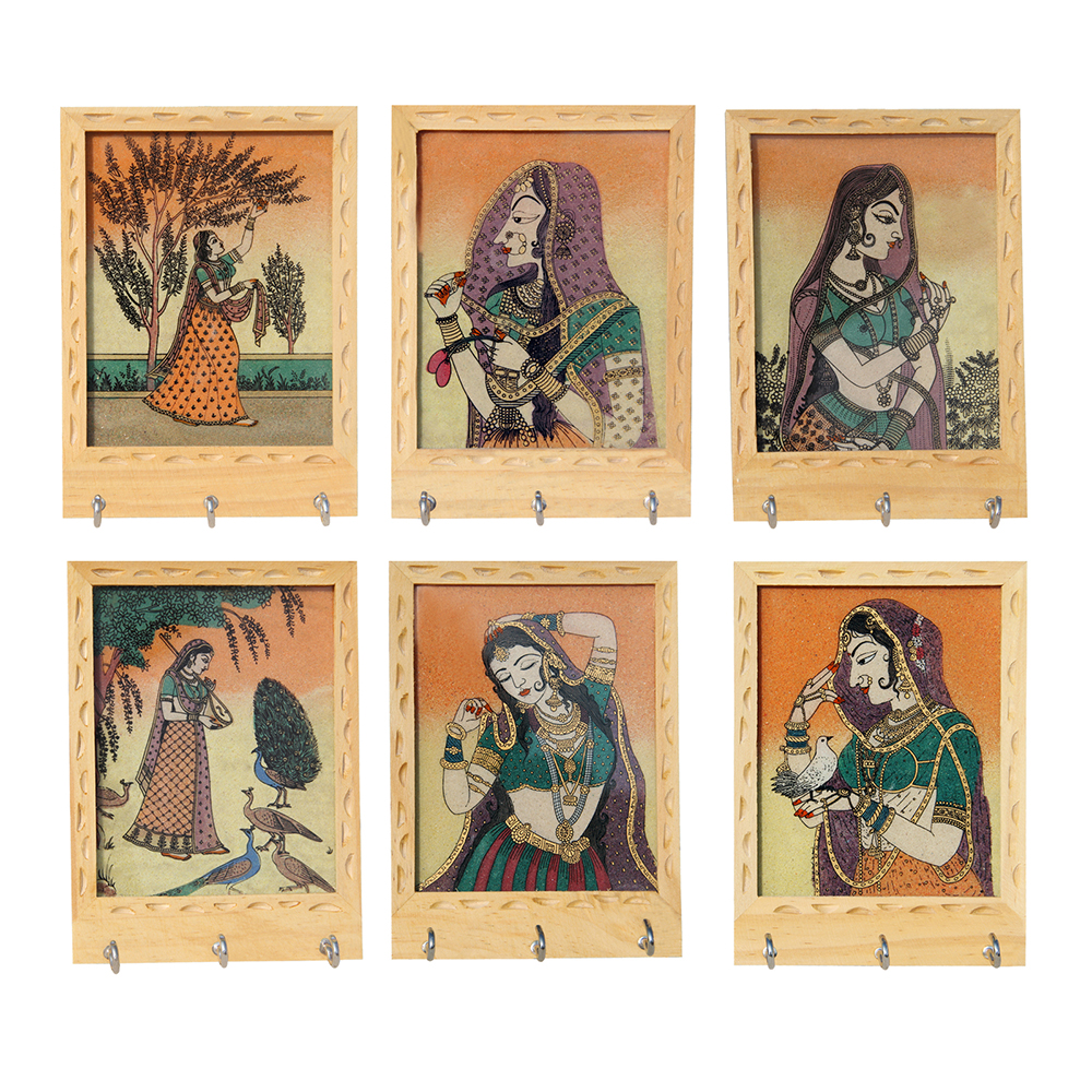 This artistic wooden key holder by Handicrafts Paradise is an amazing piece of Rajasthani art.The real gemstone work with different colors and designs on glass makes it very appealing to the eyes. The gemstone miniature painting form of Bani Thani, a beautiful female with beautiful features and rich jewellery gives it a classic aura.. It can be used as a key holder as well as a decorative piece of royal art to enhance your interiors. It is a rare piece for personal use and a gift to near and dear ones.