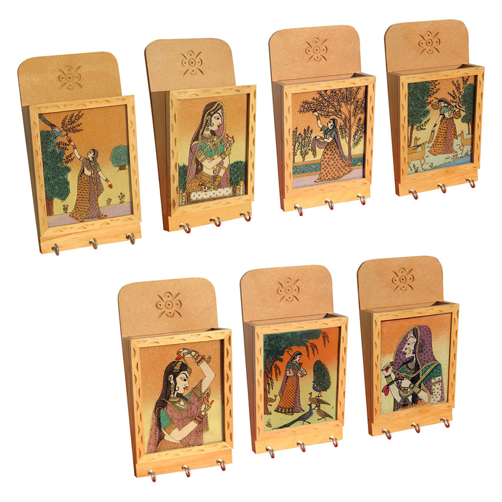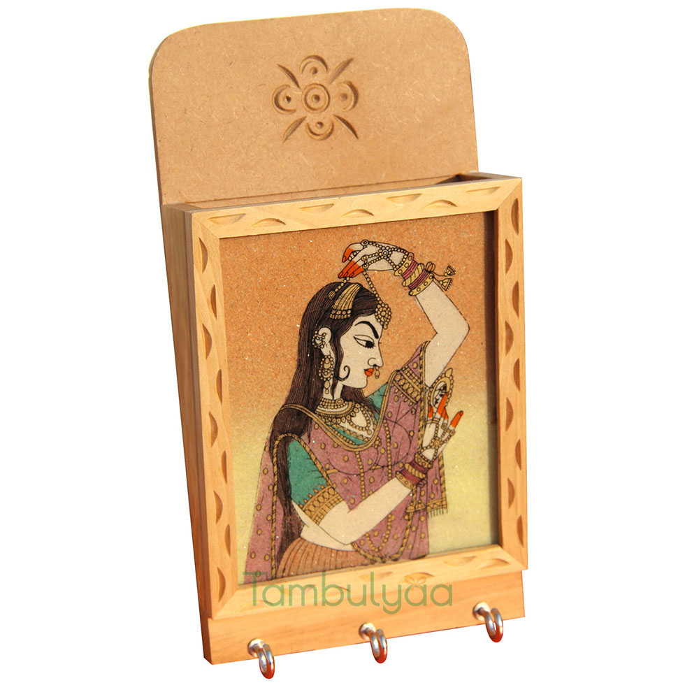 This artistic wooden letter key holder by Handicrafts Paradise is an amazing piece of Rajasthani art.The real gemstone work with different colors and designs on glass makes it very appealing to the eyes.The gemstone miniature painting of a very beautiful female adoring herself is portrayed here. The lady is doing Shringar and seeing herself in mirror.It can be used as a key holder, multipurpose holder as well as a decorative piece of royal art to enhance your interiors. It is a rare piece for personal use and a gift to near and dear ones.