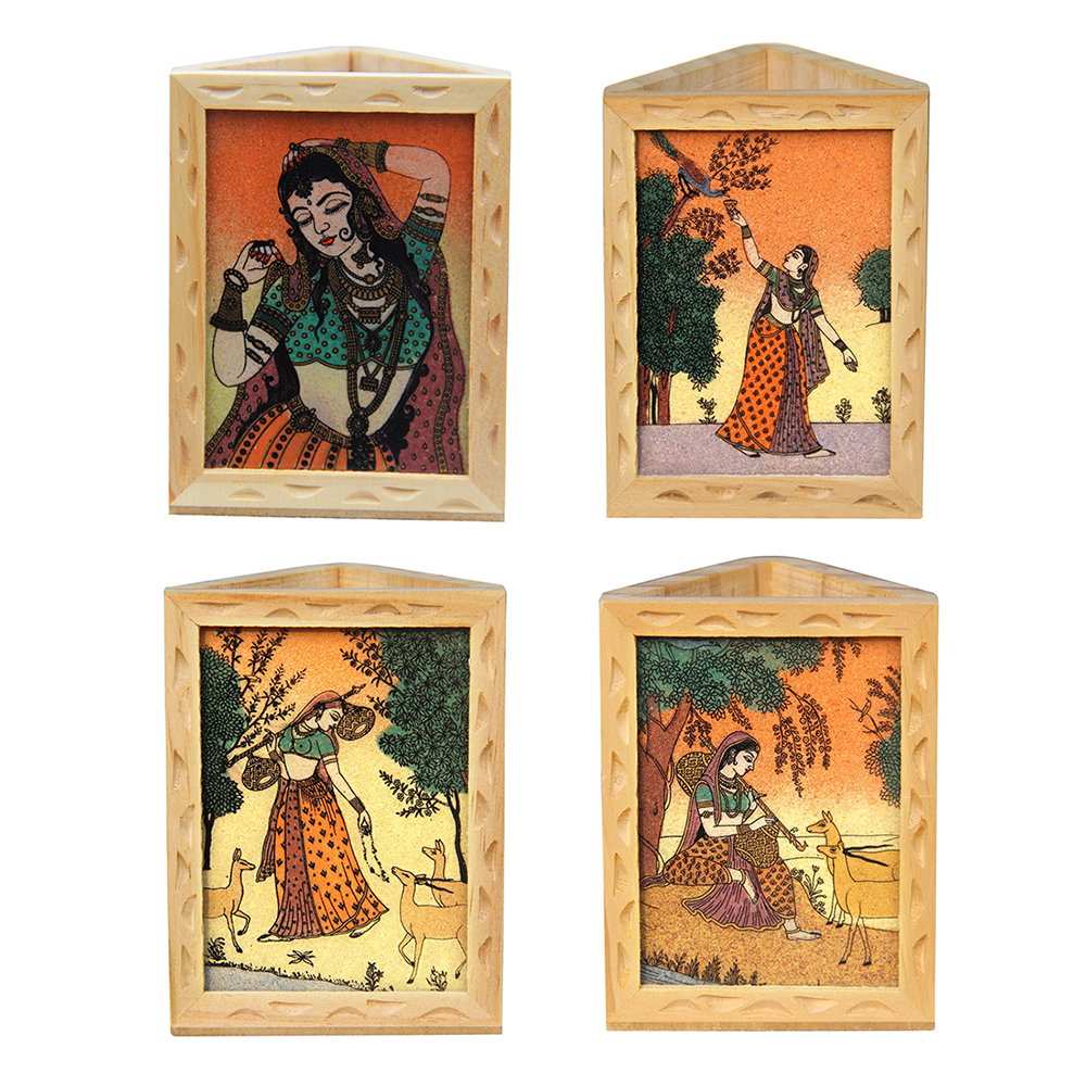 This artistic triangular wooden pen stand by Handicrafts Paradise is an amazing piece of Rajasthani art. It can be used on small tables as well. The real gemstone work with different colours and design on glass make it appealing to the eyes.. The gemstone painting of a very beautiful lady called Ragini is portrayed here.Ragini is basically fascinated by religion and loves nature and romance. Her love for the birds, music and nature is displayed here. It can be used as a pen stand and a decorative piece of art to enhance your interiors. It is a rare piece for personal use and a gift to dear ones.